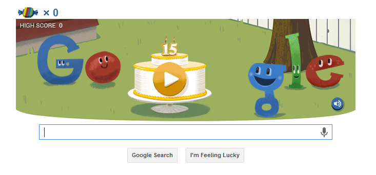 Today, Google is celebrating its 15th birthday with an interactive doodle on home page. Doodle drops virtual sweets when whacked and increases score. Google has also created a “Google in 1998” page to show how search page looked when it was launched.
