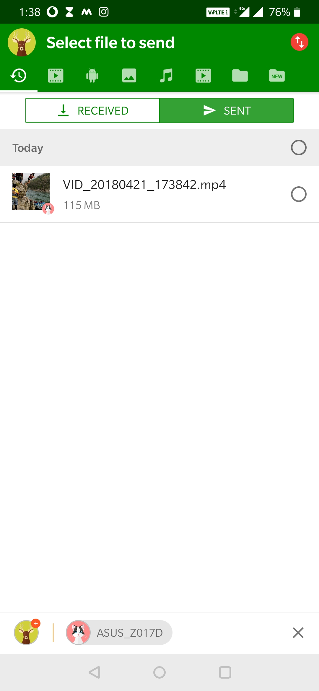 The user interface of the app is really simple and straightforward. When you open the app, it shows different tabs named History, App, Photo, Music, Video, File and New. The New tab shows recent files on your device.