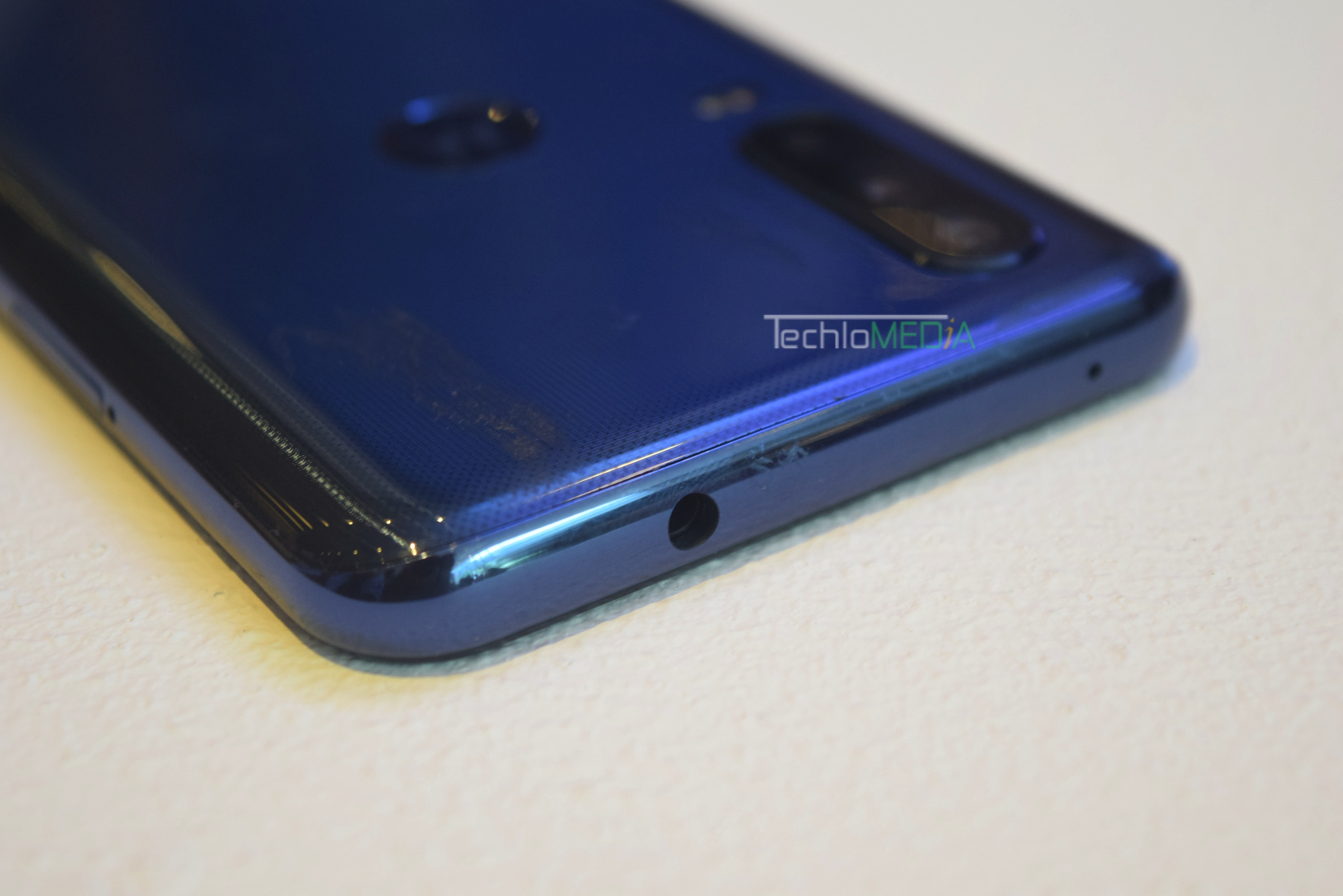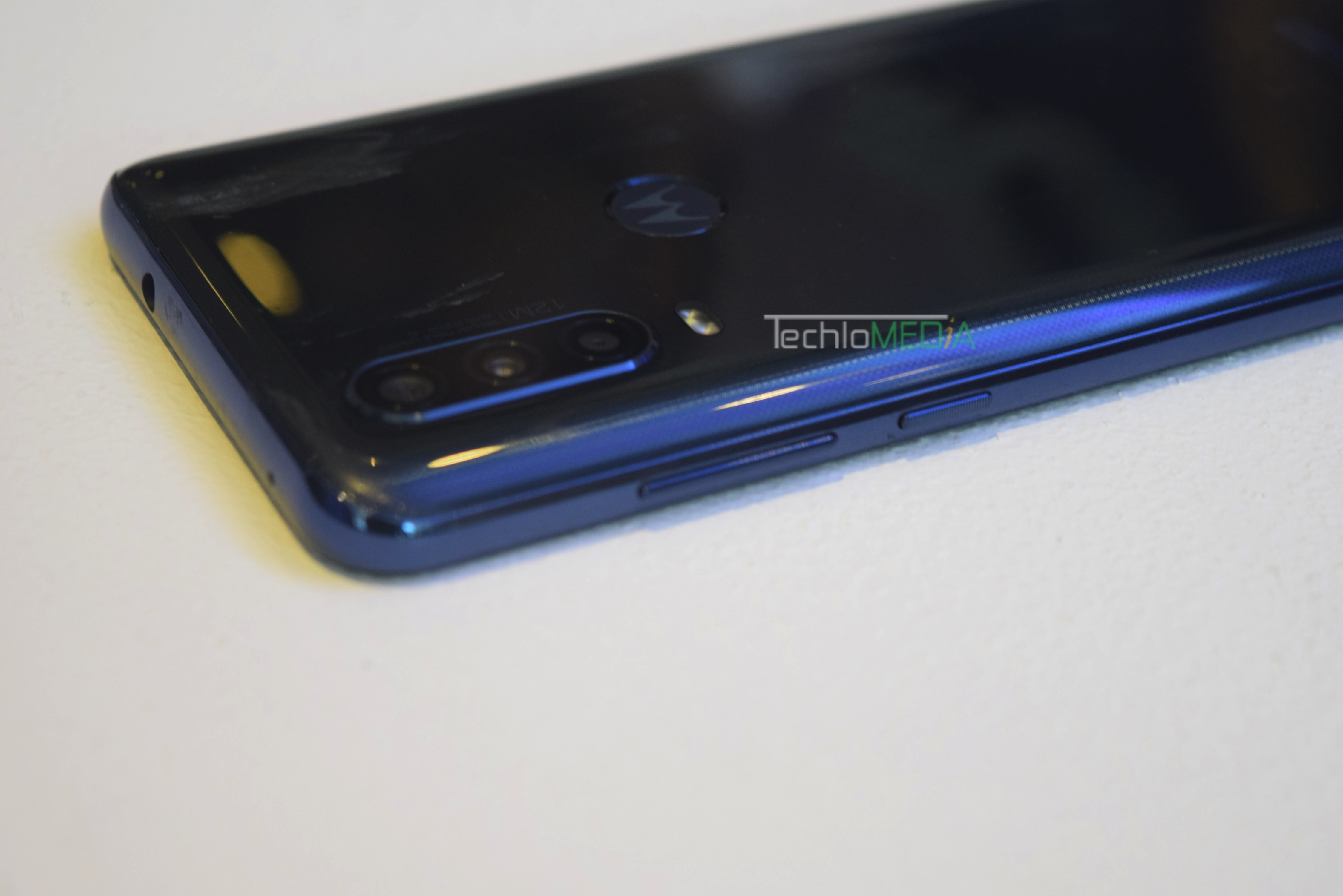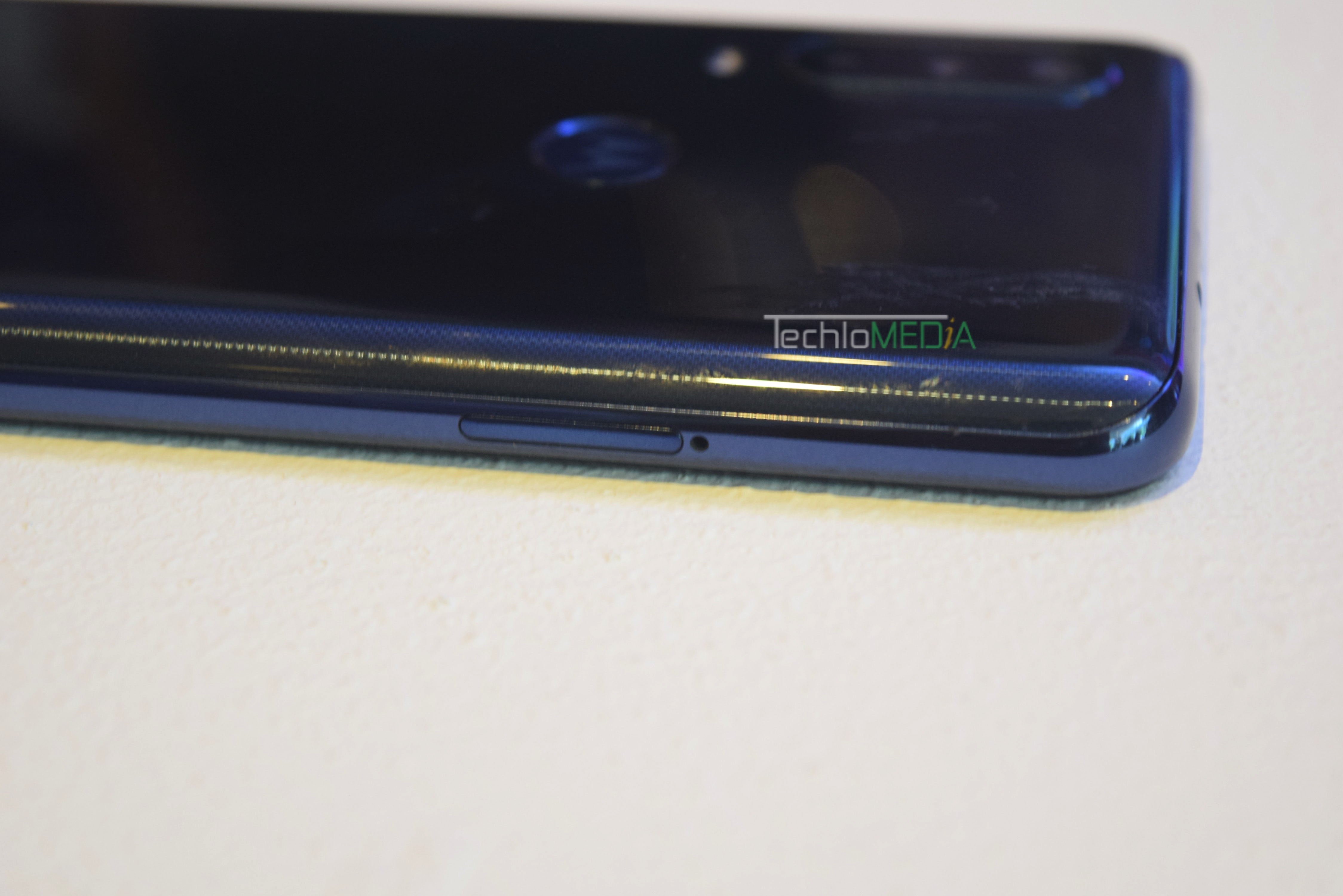 Moto One Action comes with an IPX2 rating for being splash-proof. It measures 160.1 x 71.2 x 9.15mm and weighs 176g. The phone has headphone jack at the top and speaker at the base side. The right side has the volume rocker and the left side has SIM slot. It will be available in Denim Blue and Pearl White colors but the Pearl White looks better.