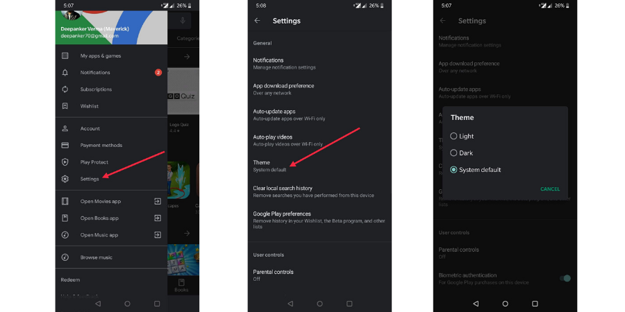 To enable the dark mode, Open Google Play and go to Settings, In Settings, navigate to the Theme menu, Here you will see the option to switch to the Dark theme.