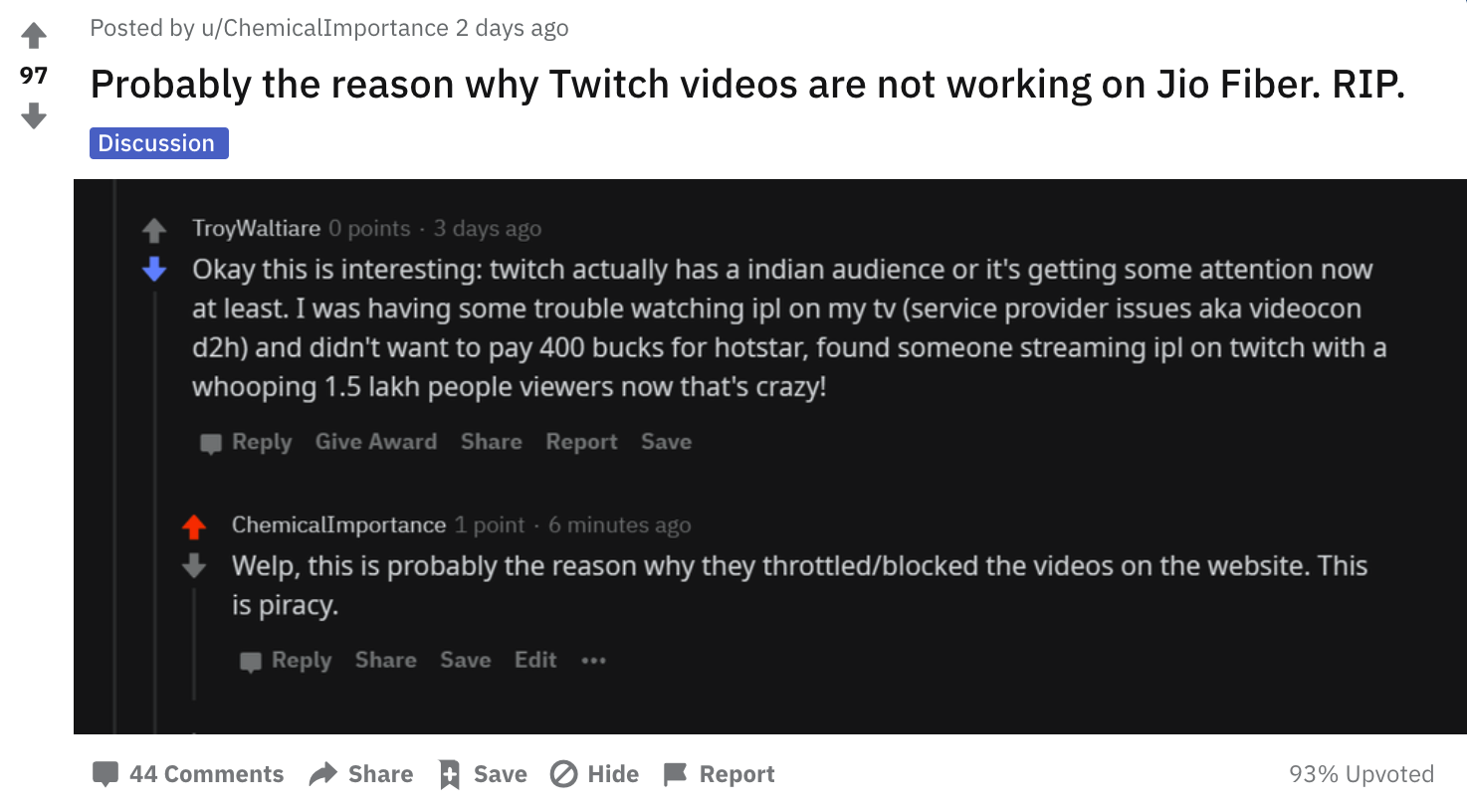 One of the most probable reason could be the live streaming of IPL 2020 matches. A few users are using Twitch to live Stream Hotstar broadcasts on Twitch. Some of these Twitch streams are also getting massive views. To avoid users from watching these pirated streams, Jio has decided to block access to the whole app.