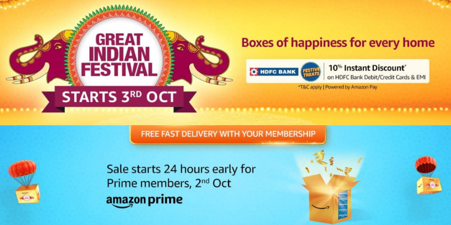 Amazon Great Indian Festival 2021 sale is starting 2nd October at 12 AM for Prime Subscribers. It will begin for all Amazon users on the 3rd of October (Saturday) night. There are hundreds of deals overall major product categories like home electronics, laptops, smartphones, and more. There are 10 percent instant discounts on HDFC Bank debit and credit card users.