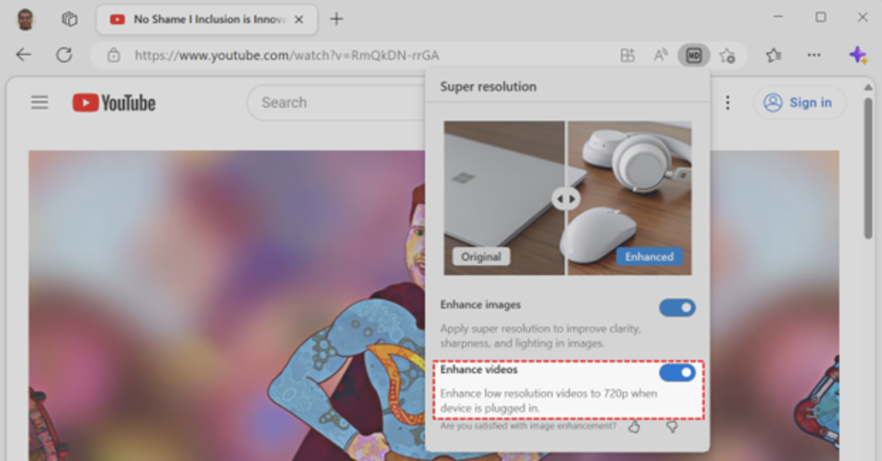 Video super resolution will be automatically enabled by Edge. There will be an HD icon on the address bar to indicate the feature. The feature is also computationally intensive, it allows users to enable or disable it.