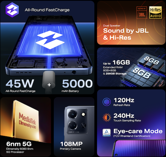 Infinix Note 30 5G features a 6.78-inch Full HD+ LCD display with 120Hz refresh rate, MediaTek Dimensity 6080 6nm processor, Mali-G57 MC2 GPU, up to 8GB RAM, up to 256GB storage, and 5000mAh battery with 45W fast charging.
