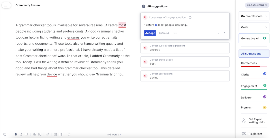 Grammarly editor also provides the overall score of your document on a scale of 100 to tell you the quality of your writing. In this way, it also helps you in becoming a better writer. You learn new words, grammar rules, and more with the help of this grammar checker tool.
