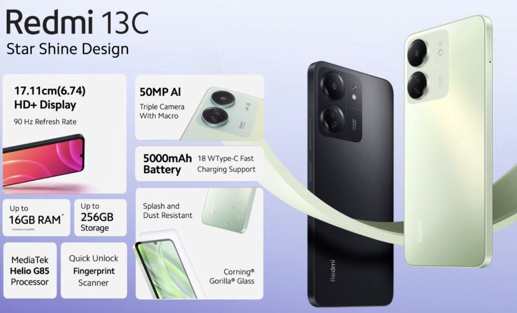 Redmi 13C comes in Starshine Green and Stardust Black colors. It will be available starting December 12th.