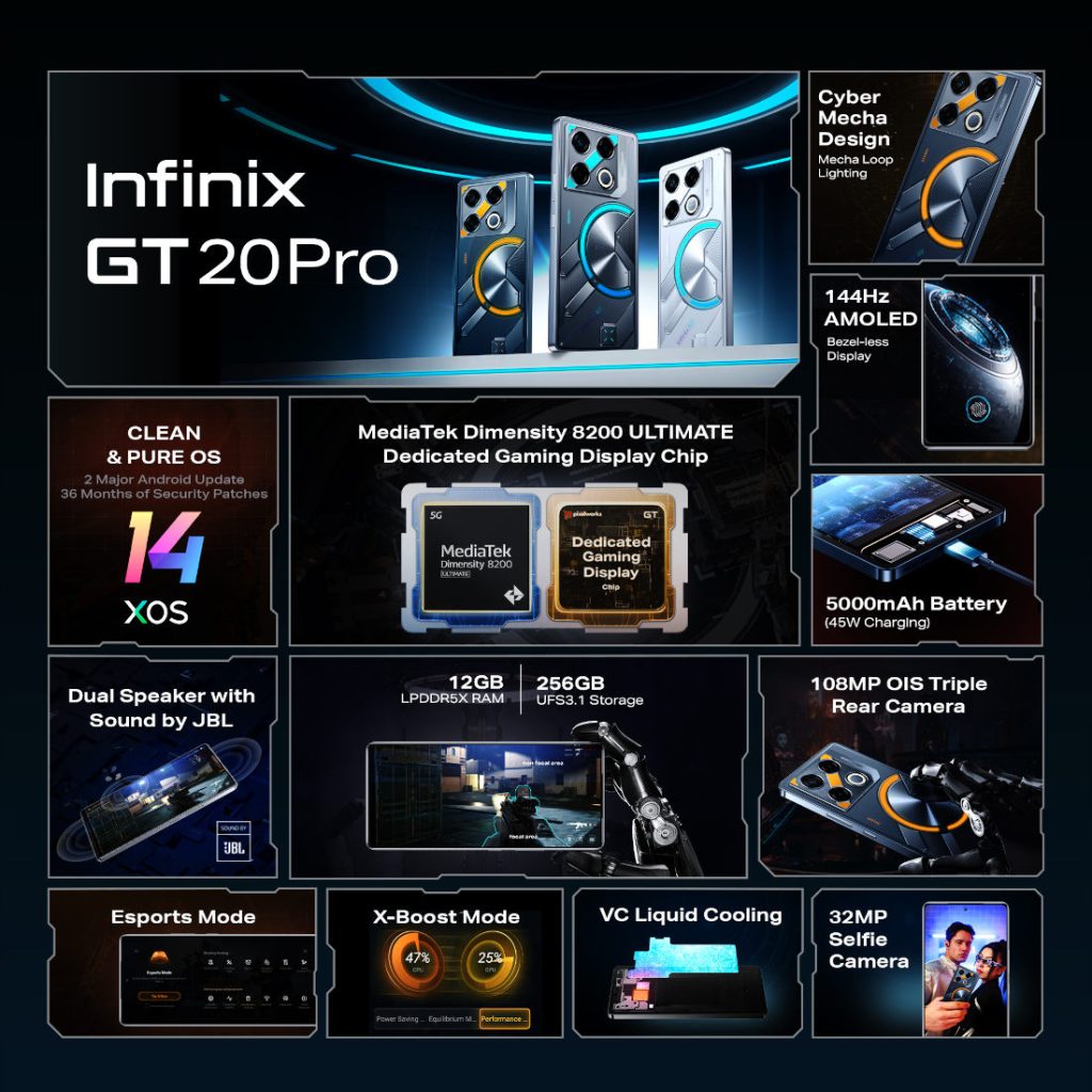 Infinix GT 20 Pro features a 6.78-inch FHD+ AMOLED display with 144Hz refresh rate and 360Hz touch sampling rate. The company has also added Pixelworks X5 Turbo Gaming Display Chip to bring premium visual processing technology to the phone. The chip promises to boost the frame rate of game content up to 120fps.