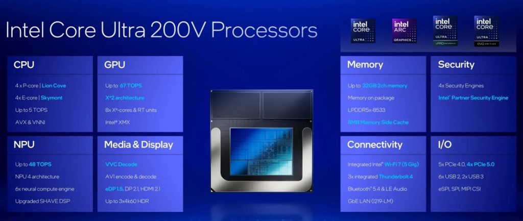 Intel Core Ultra 200V series processors are designed to deliver superior low-power performance for AI-powered PCs. The company confirmed that it managed to reduce power consumption by up to 50% and achieved up to 120 TOPS CPU, GPU, and NPU.