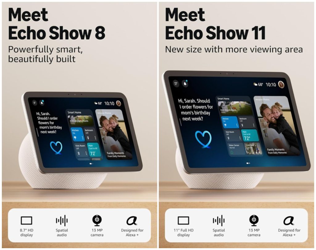 The Echo Show 8 and Echo Show 11 have improved screens with in-cell touch and enhanced displays for clearer visuals. Both devices feature a 13MP camera capable of recognizing who is looking at the screen, allowing for personalized answers. These devices act as a media control center and include a built-in smart home hub that supports Zigbee, Matter, and Thread. Users can view family calendars, manage tasks, and shop using the Alexa+ shopping widget for Amazon, Whole Foods, and Amazon Fresh. The devices will also connect to health and wellness services, starting with Oura and expanding to partners like Withings and Wyze. Audio is delivered through front-facing stereo speakers, a custom woofer, and full-range drivers for room-filling sound.