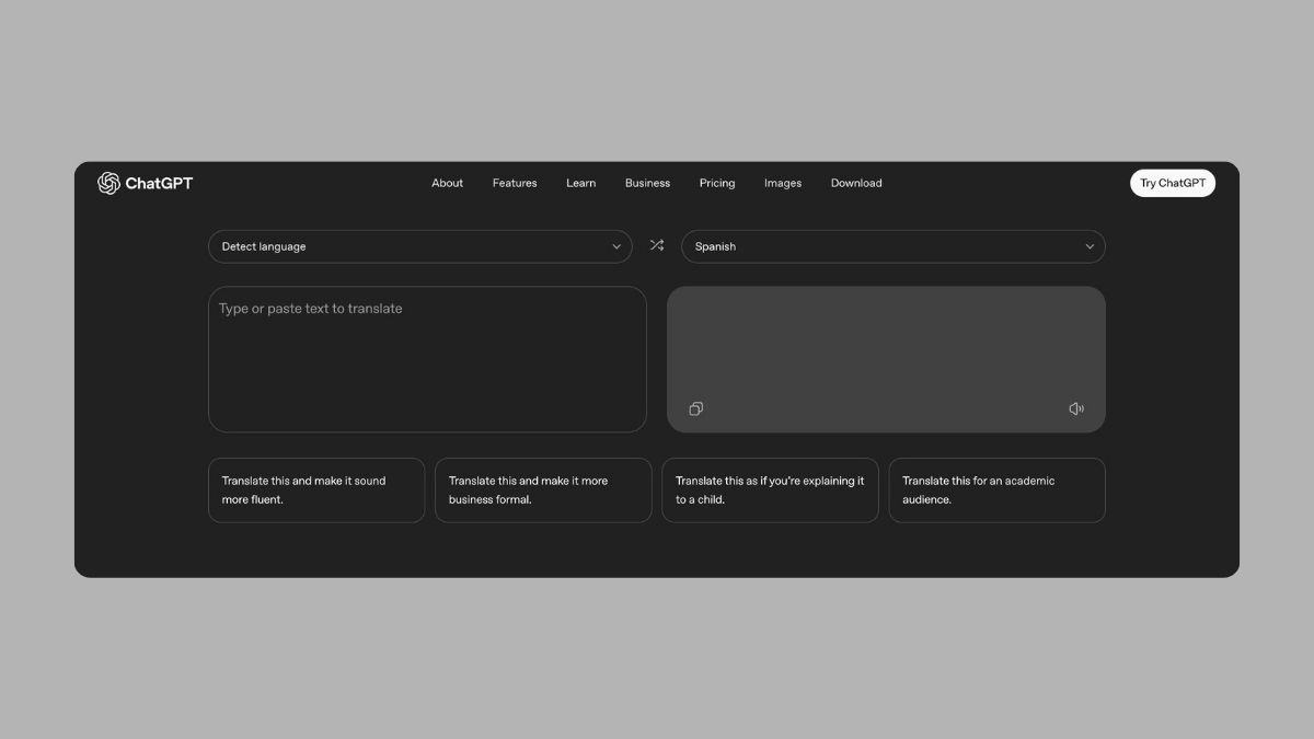 People could always use ChatGPT for translation, but this is a dedicated tool for translation. You can access it directly by visiting chatgpt.com/translate. The interface looks familiar and simple. There are two text boxes side by side. You paste or type your text on the left, and the translated output appears on the right. The tool also supports automatic language detection.