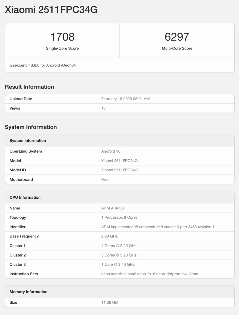 The tested unit on Geekbench had 12GB of RAM and was running Android 16. It is likely to ship with Xiaomi’s HyperOS 3 on top.