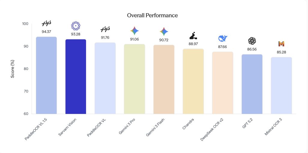 The model has also performed strongly on OmniDocBench v1.5, which tests how well AI systems read and understand real world documents. Sarvam Vision scored 93.28 percent overall, with particularly strong results in complex layouts, technical tables, and mathematical formulas. These areas are usually difficult for traditional OCR systems because of dense formatting and inconsistent structure.