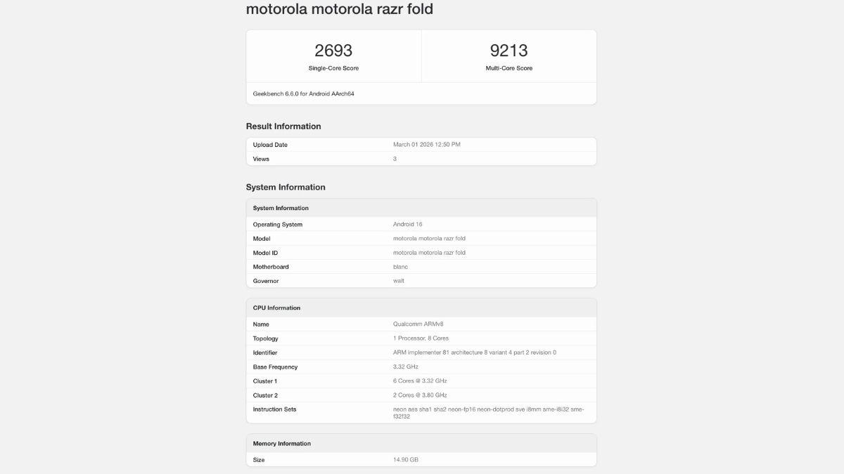 In Geekbench CPU tests, the Razr Fold scored 2693 points in single-core and 9213 points in multi-core performance. These scores are very close to what the Samsung Galaxy Z Fold 7 achieved with its Snapdragon 8 Elite chip. The Galaxy Z Fold 7 scored around 2703 in single-core and 9317 in multi-core tests. This shows that Motorola’s foldable will deliver flagship-level performance and can compete directly with Samsung’s premium foldable lineup.