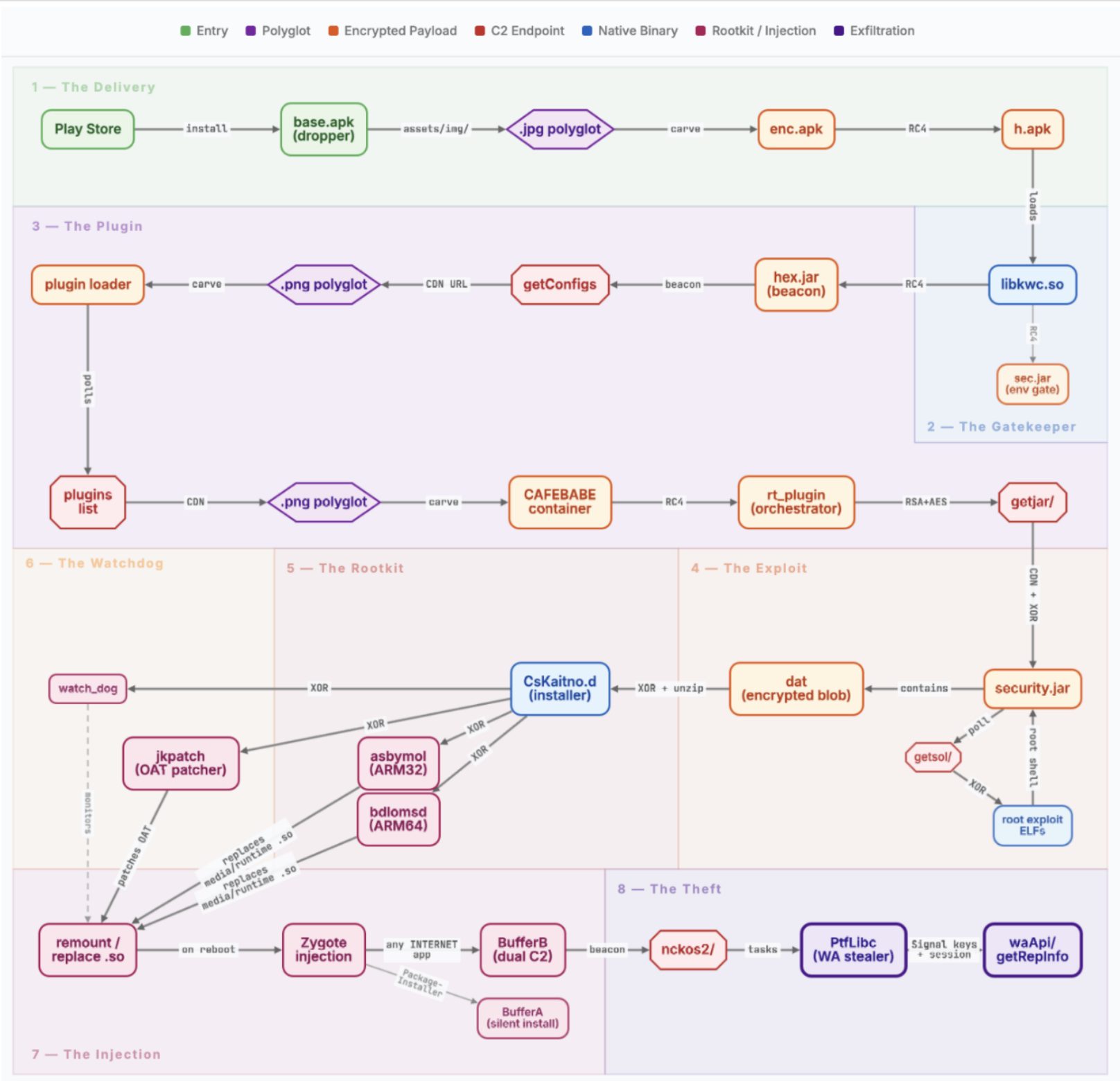 The malware uses multiple exploits to gain full control of the device. Researchers observed at least 22 different exploits being used. After gaining root access, it disables key security protections and modifies system files. It replaces important libraries with malicious versions, allowing it to control how the system behaves. It also installs itself deeply into the system, making it very hard to remove. Even a factory reset may not fully clean the device, as parts of the malware can survive.