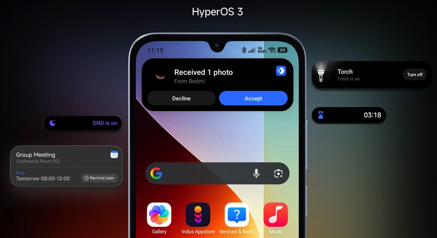 The Redmi A7 Pro 5G runs on Xiaomi HyperOS 3.0. It brings features like Google Gemini integration and Circle to Search. Xiaomi HyperIsland is included for better multitasking, and Xiaomi Interconnectivity allows seamless connection with other Xiaomi devices.