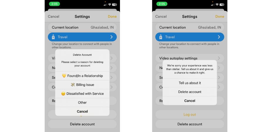After selecting a reason, Bumble will ask you to confirm that you want to delete your account. If you are sure you want to proceed with the deletion, tap on “Delete Account” again.
