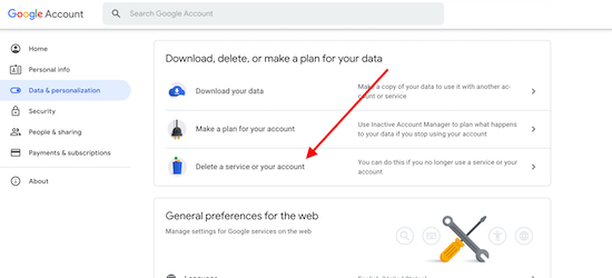 Scroll to “Download, delete, or make a plan for your data.” Click Delete a service or your account.