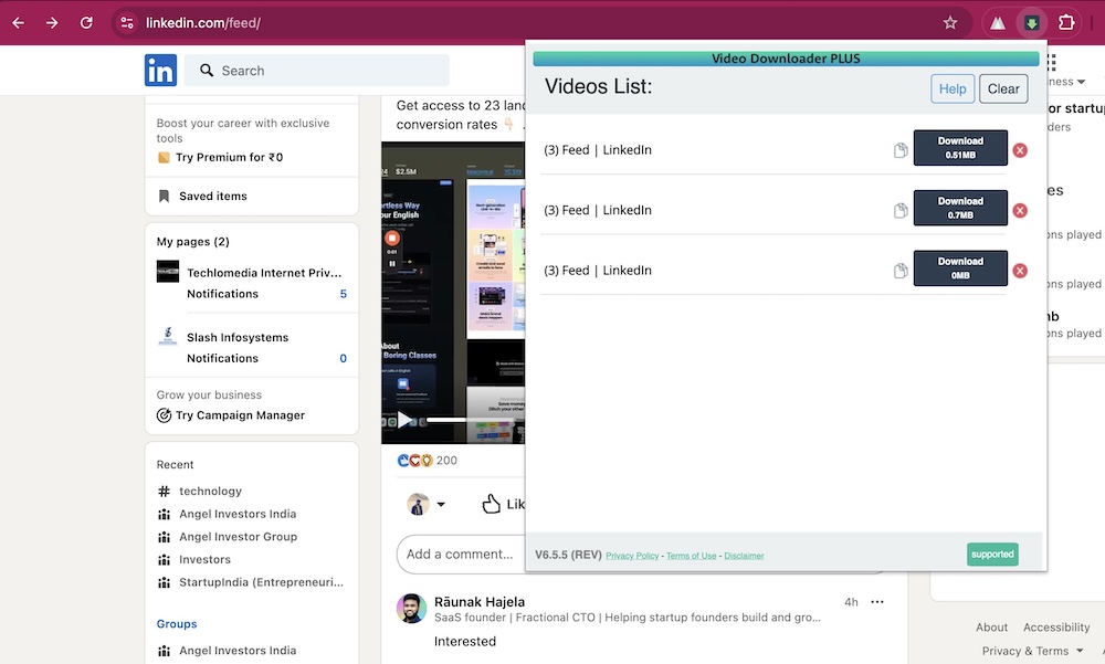If you use Google Chrome browser, Video Downloader Plus is a good extension for downloading videos. This Chrome extension supports almost all websites including LinkedIn. It automatically detects the video on the page and provides a link to download it. It supports Facebook, X, LinkedIn, Twitch, Vimeo, Dailymotion, and more. After you have Installed the Chrome extension, start browsing Linkedin on the browser. Whenever you find a video on Linkedin, this extension will add a link to download the video.