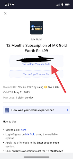 Once you purchase the MX Gold membership using Supercoins, Flipkart will show you an offer page. It will give you the Promo code along with a link to activate your MX Gold membership.