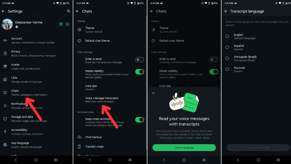 To enable Voice Note Transcription, open the WhatsApp Settings screen and tap Chats. Here, tap Voice Messages Transcripts. It will ask you to select the language for message transcription.