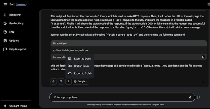 Google Bard provides responses to your prompt with options to export the response to Google Docs and Gmail. So, you don’t need to copy and paste the content.