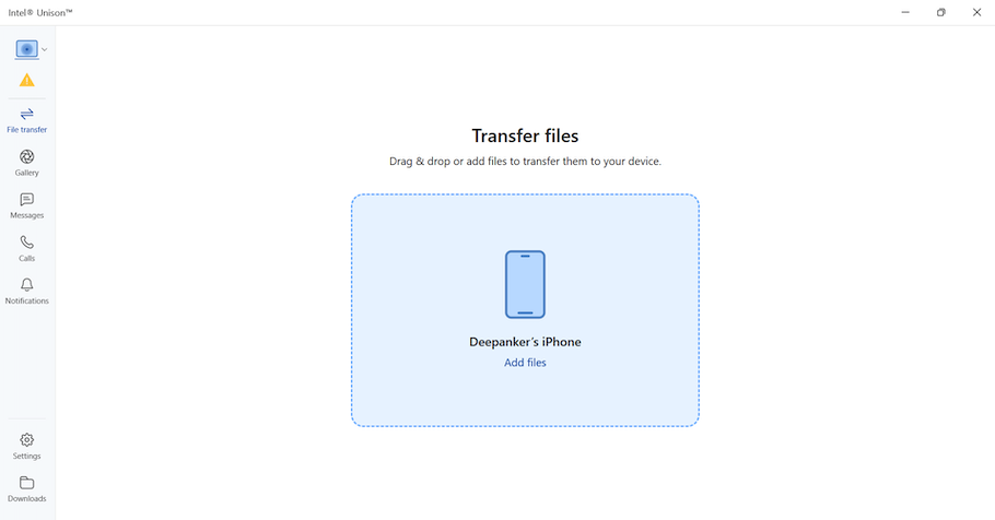 The desktop app has a clean interface. It has a sidebar with options for File Transfer, Gallery, Messages, Calls, and Notifications. Use relevant options depending on your needs. For sending a file from phone to PC, you the Intel Unison app on your phone. If you want to send a file from a PC to a phone, go to File Transfer, select the file, and send it to the phone. I use it with my Windows laptop and iPhone. The connection works flawlessly.