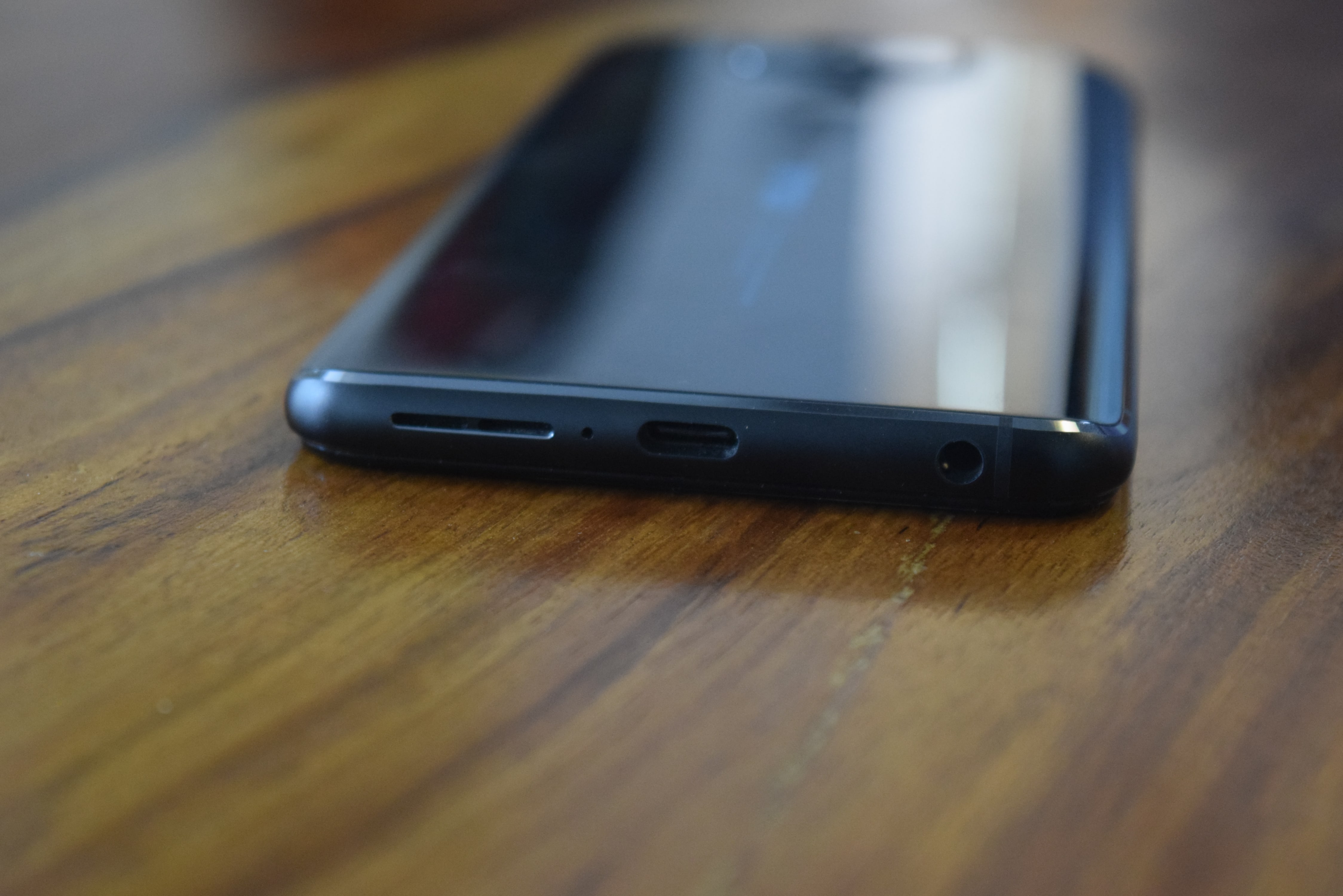 The left edge has SIM card a try that can accommodate two Nano-SIMs and a microSD card. The base side has a USB Type-C port, 3.5mm audio jack, and a speaker. This speaker works as a stereo pair with the earpiece.