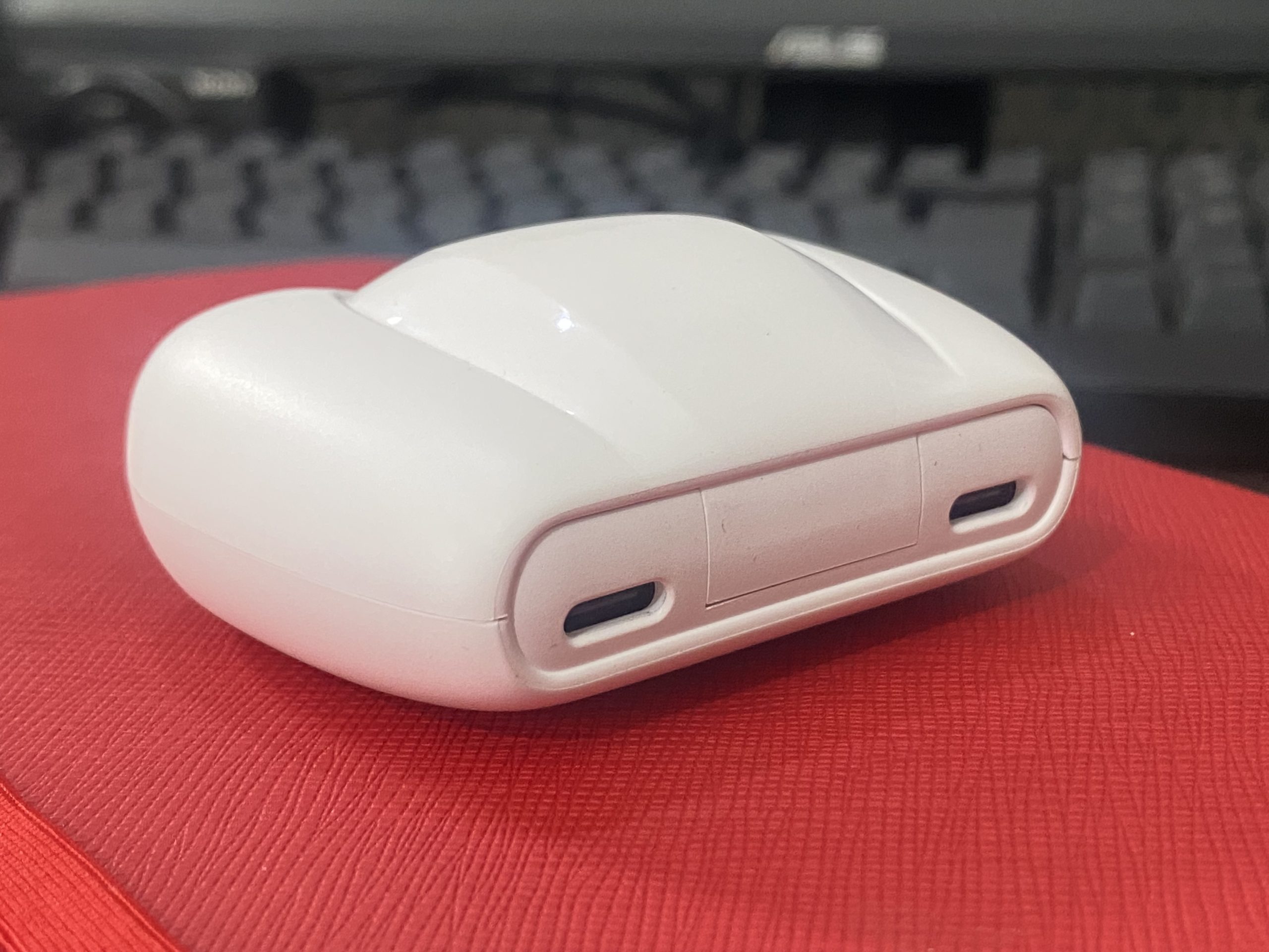 This unique charging case has LED lights at the front offering a breathing effect. This looks really cool. When you open the case, you see 4 LED arrays that turn on one by one. This also acts as a battery level indicator. Light stops at the current case battery level. If it stops at the third light, it means the battery level is between 50-75%. If you look at the back, there are two Type-C ports for charging.