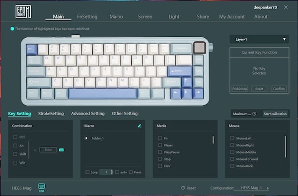 Another standout feature of HE65 Mag’s features is quad-actuation, also known as Dynamic Key Stroke. You can assign up to four actions to a single key based on how deeply you press it. Two on the way down and two on the way back up. This is incredibly useful in games. For example, a short press on the W key can make your character walk, while a deeper press can make them sprint.