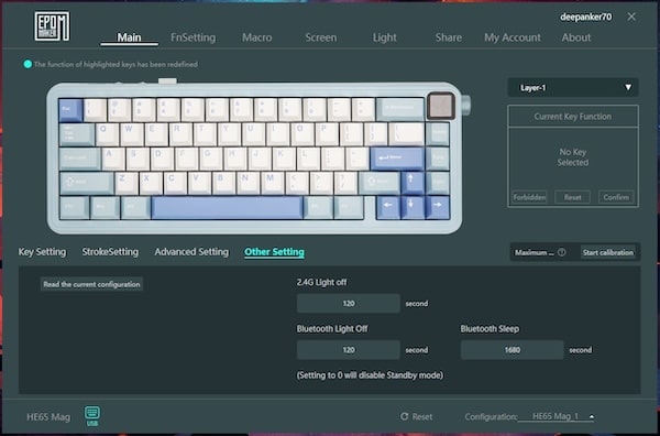 The HE65 Mag comes equipped with pre-lubed Gateron Magnetic White linear switches. These are among the lightest switches I have tested, actuating at just 30 grams of force. They are smooth, quiet, and perfect for long gaming or typing sessions without fatigue. Like other Hall Effect switches, you can adjust the actuation point from 0.1mm to 4mm using the Epomaker Driver software. This level of control means you can make the switches as sensitive or as firm as you like. When set to 0.1mm, even the slightest touch activates the key. This is great for fast-paced games like Counter-Strike 2 or Hitman, though you need to be careful to avoid accidental presses.