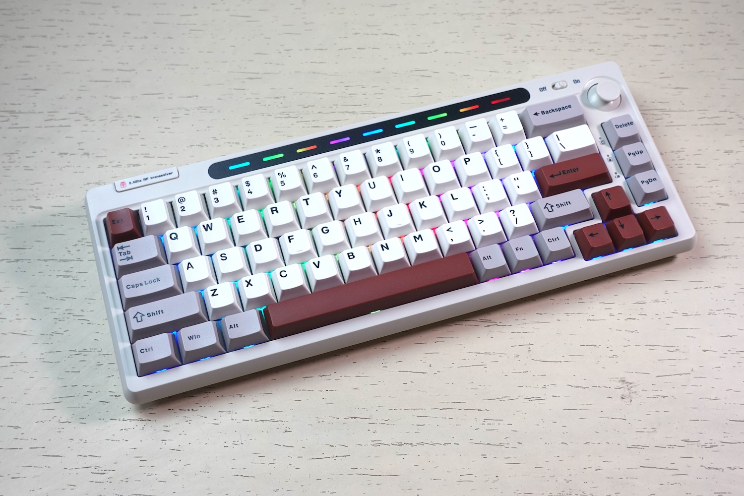 The Epomaker RT65 is a 65% keyboard with only 67 keys. It retains all essential keys while eliminating the clutter of a full-sized keyboard. So, it is perfect for small desk spaces. People who want a minimalist design without compromising functionality will surely love it. It has a retro-inspired color scheme that includes white keycaps with gray accents and a touch of brown that stands out. The ABS plastic case ensures a lightweight build as the keyboard carries a weight of just 0.8kg. The build also feels durable enough for everyday use. It has PBT keycaps with a Cherry profile design and a textured surface to resist shine and wear over time.