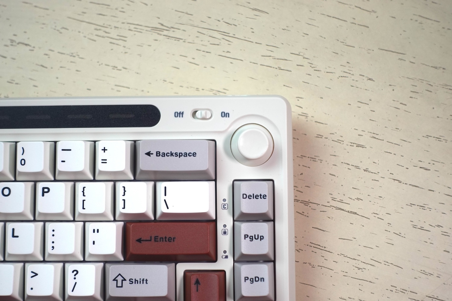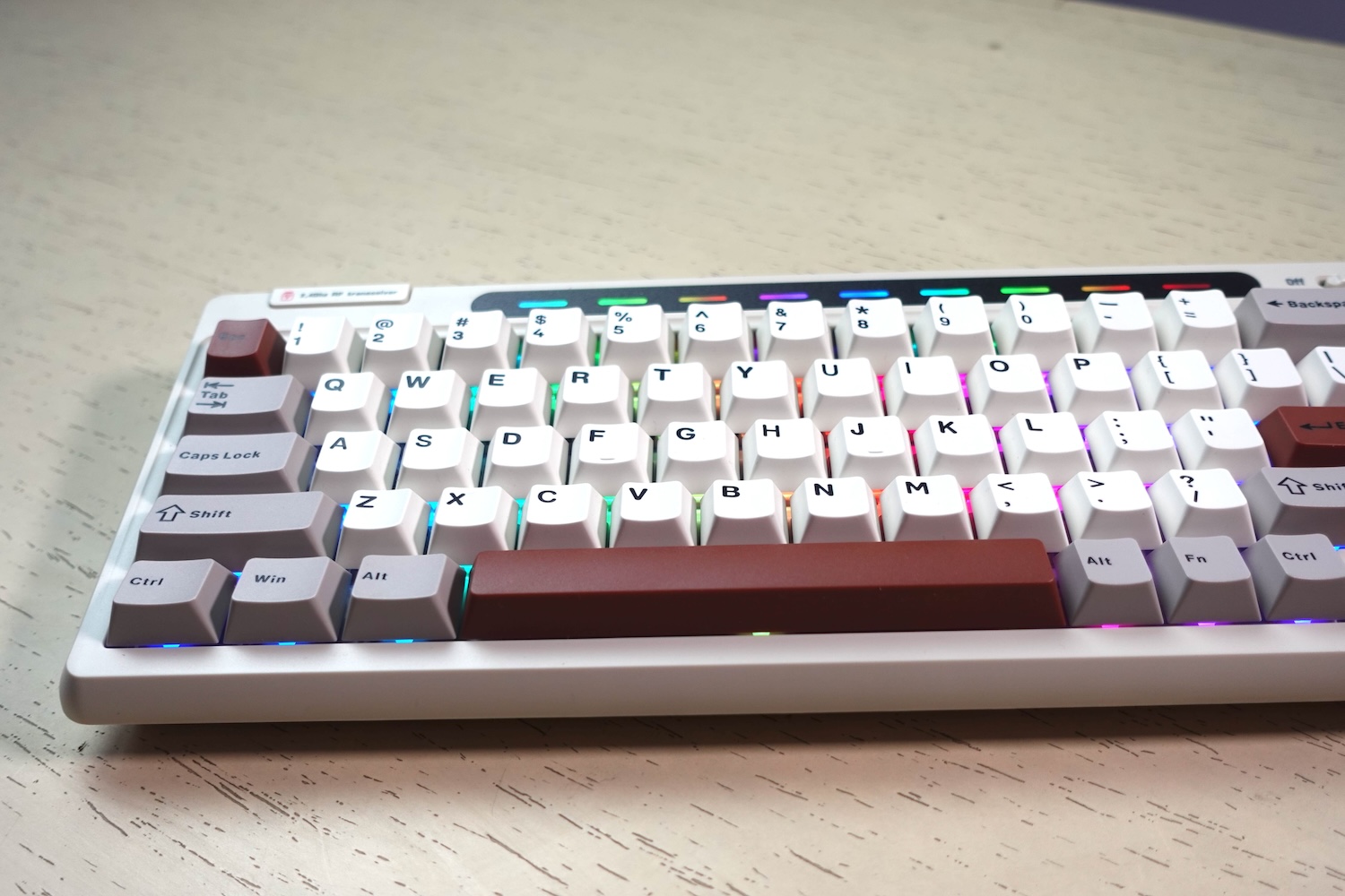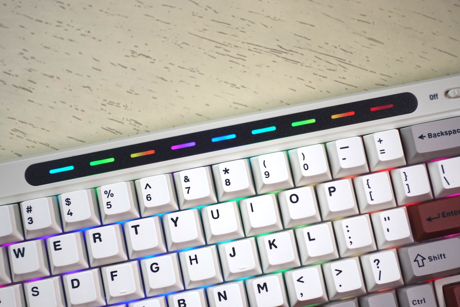 At the top above all keys, it has a RGB lightbar that looks really cool. It is just for design purposes and doesn’t have any functionality. The light bar adds a stylish touch to the keyboard and makes it visually striking.