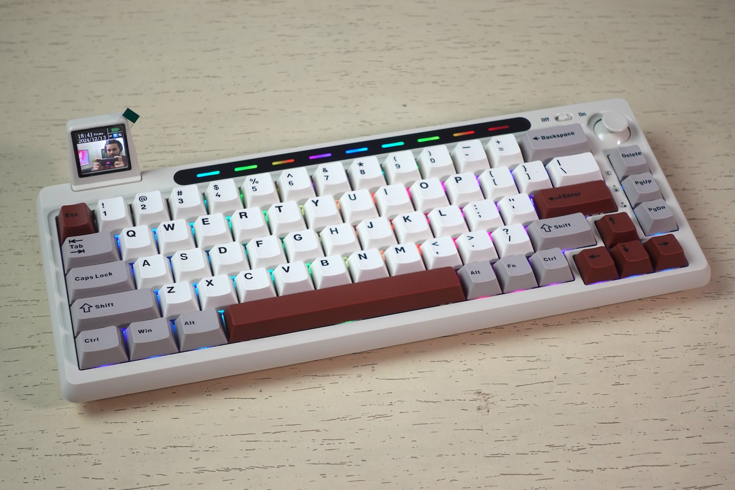 At the top edge of the keyboard, you see a Type-C on the right side. This is to plug the Type-C cable for wired connectivity. On the left, there’s the same hidden compartment that hides the wireless dongle and Tyoe-C port. You can use this Type-C port to attach the mini Display that comes with the keyboard. This mini-display shows the date, time, and battery status. You can customize it to add a photo or animation using Epomkaer software.