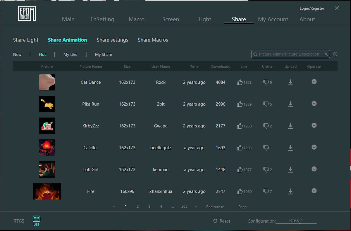 The Screen section lets you customize the mini display. You can Personalize the screen with logos, gifs, or static images. You can go to the Share section and find cool animations to add to the mini-display. Here, it curates Light Animation, Settings, and Macros shared by other users. You can also share your own with the community.