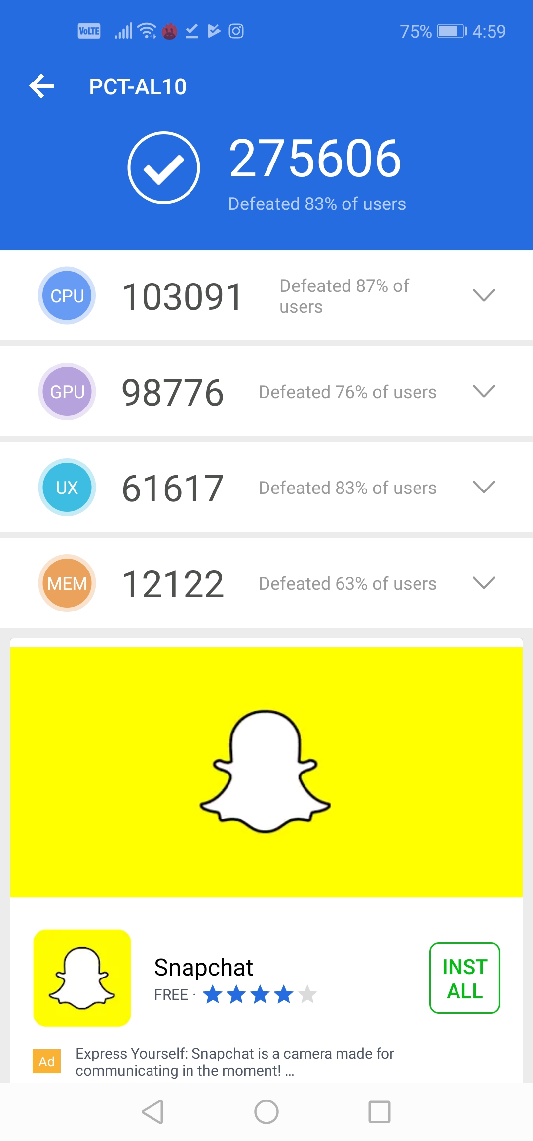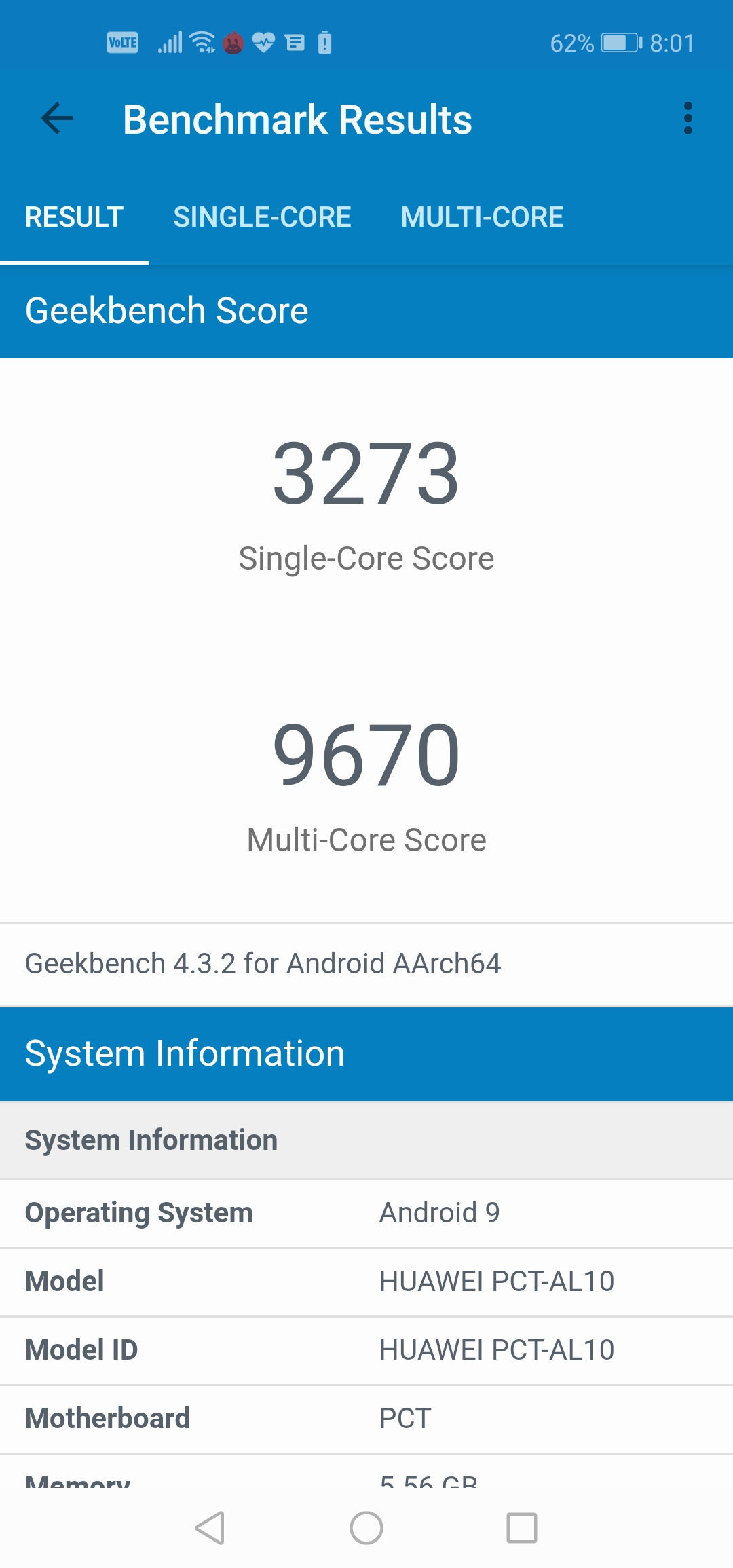 The phone scores 275606 on Antutu benchmarks. On Geekbench, the single core score was 3273 while the multicore score was 9670.