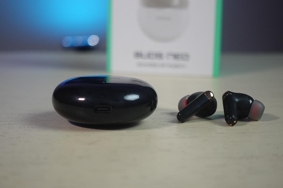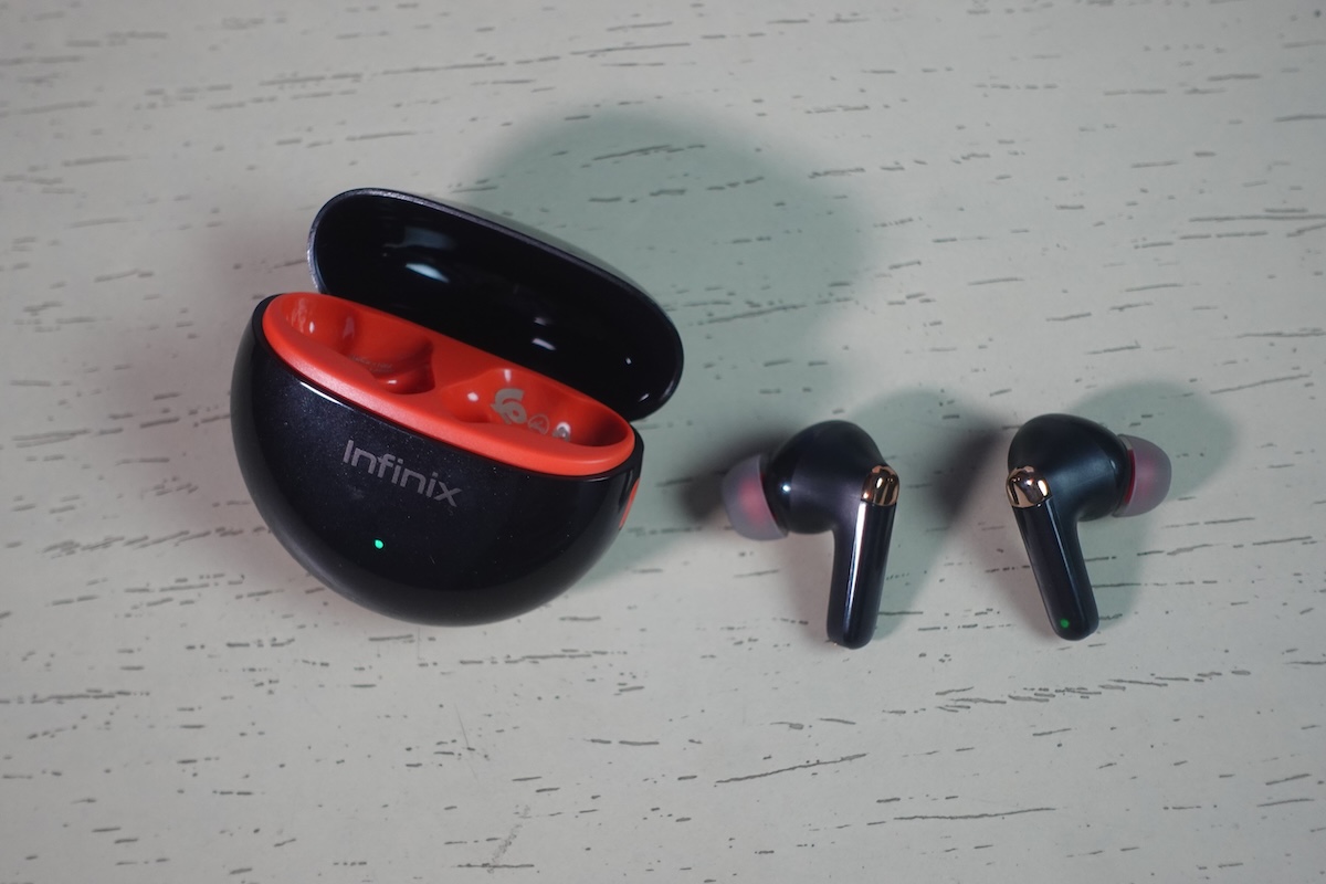 The Infinix Buds Neo comes in a compact, pebble-shaped charging case that is made from a sturdy plastic material. The case features a glossy finish that feels really premium but it will attract fingerprints and scratches quite easily. It features a small LED indicator light that indicates battery charging status. There’s also a place to attach the lanyard for easy carrying or to prevent it from getting lost. There’s also a USB-C port for charging it. The lid opens smoothly with a satisfying click. The hint of orange inside the case looks good.