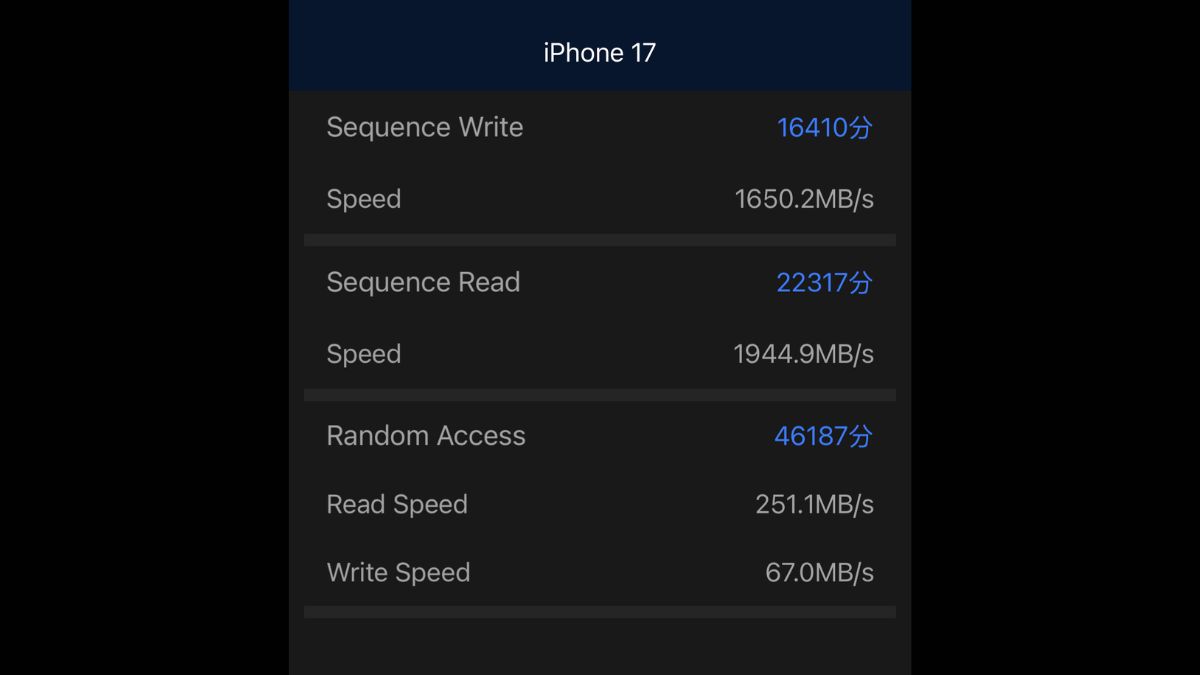 The phone comes with 8GB of RAM, which is the same as the iPhone 16, but less than the 12GB in the Pro lineup. Even so, iOS memory management remains excellent. You can switch between multiple heavy apps without reloads. The good news is that Apple has doubled the base storage to 256GB. It is ultra-fast NVMe storage to ensure smooth app loading and file transfers. From the screenshot below, you can check the sequential write speed of 165MB/s and the sequential read speed of 1944.9MB/s.