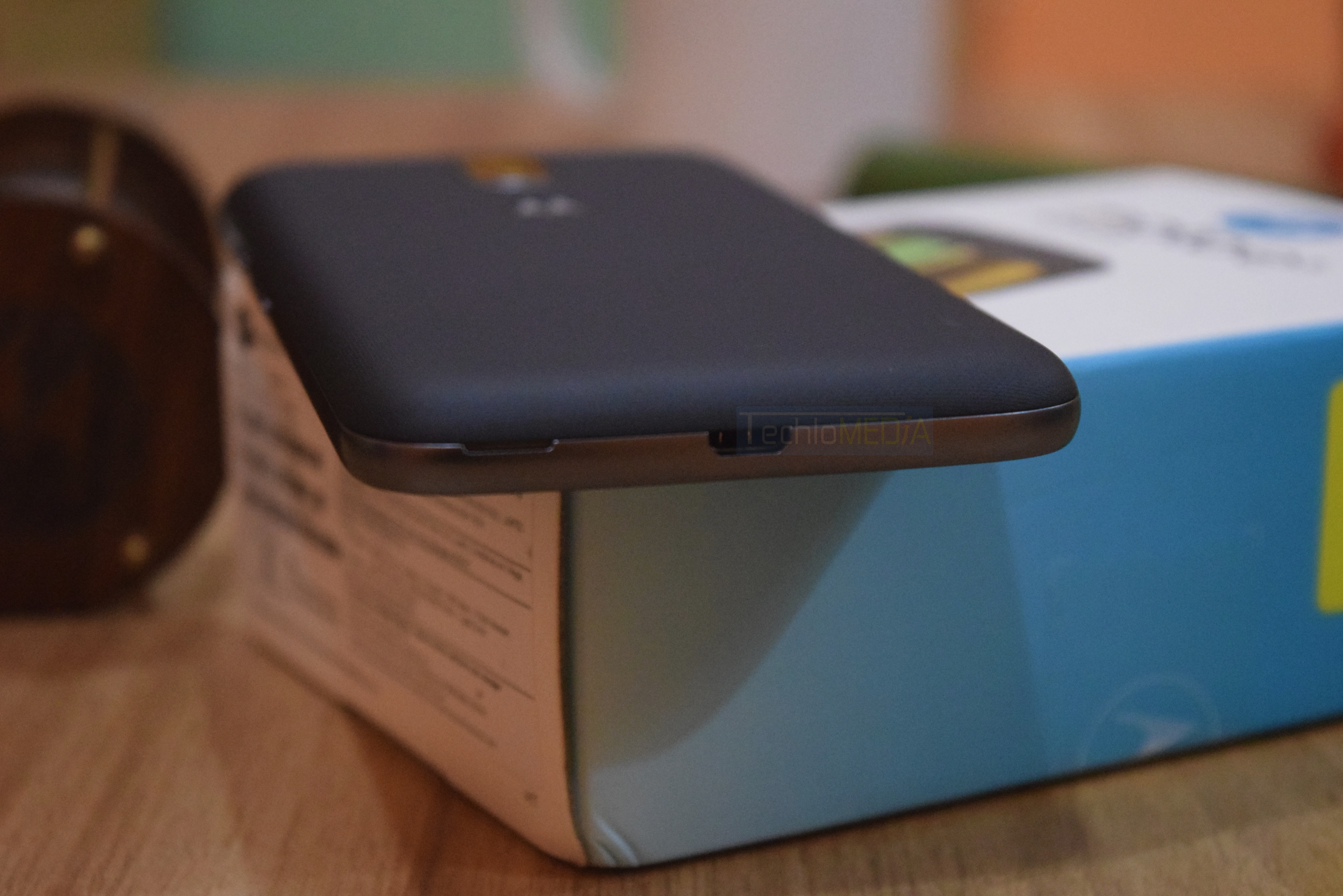 At the right edge of the phone, it has the power button and volume rocker keys. Buttons are at easy to reach position and response is also fine. It has 3.5 mm audio port on the top and micro USB at the bottom edge. If you look at the back panel, you see the rear camera and LED flash just below it. Below the camera system, it has Moto dimple. The back panel has textures that provide good grip and feels good.