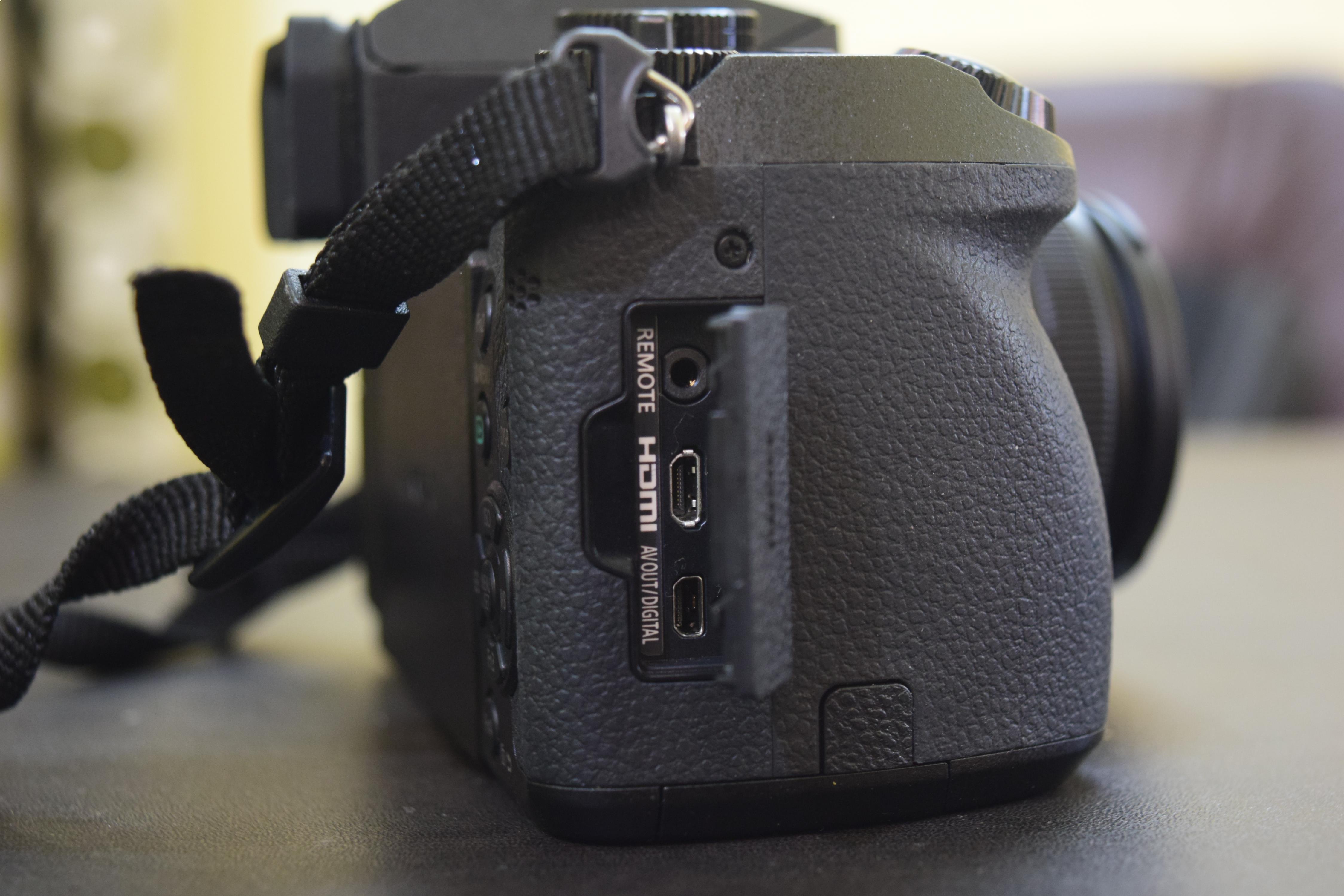 On the right side, it has three connectors: a remote shutter control, Micro-HDMI and proprietary combination AV- and USB-out. On the left, it has a standard microphone input. At the base side, It has a lock that opens a slot for battery and SD card.
