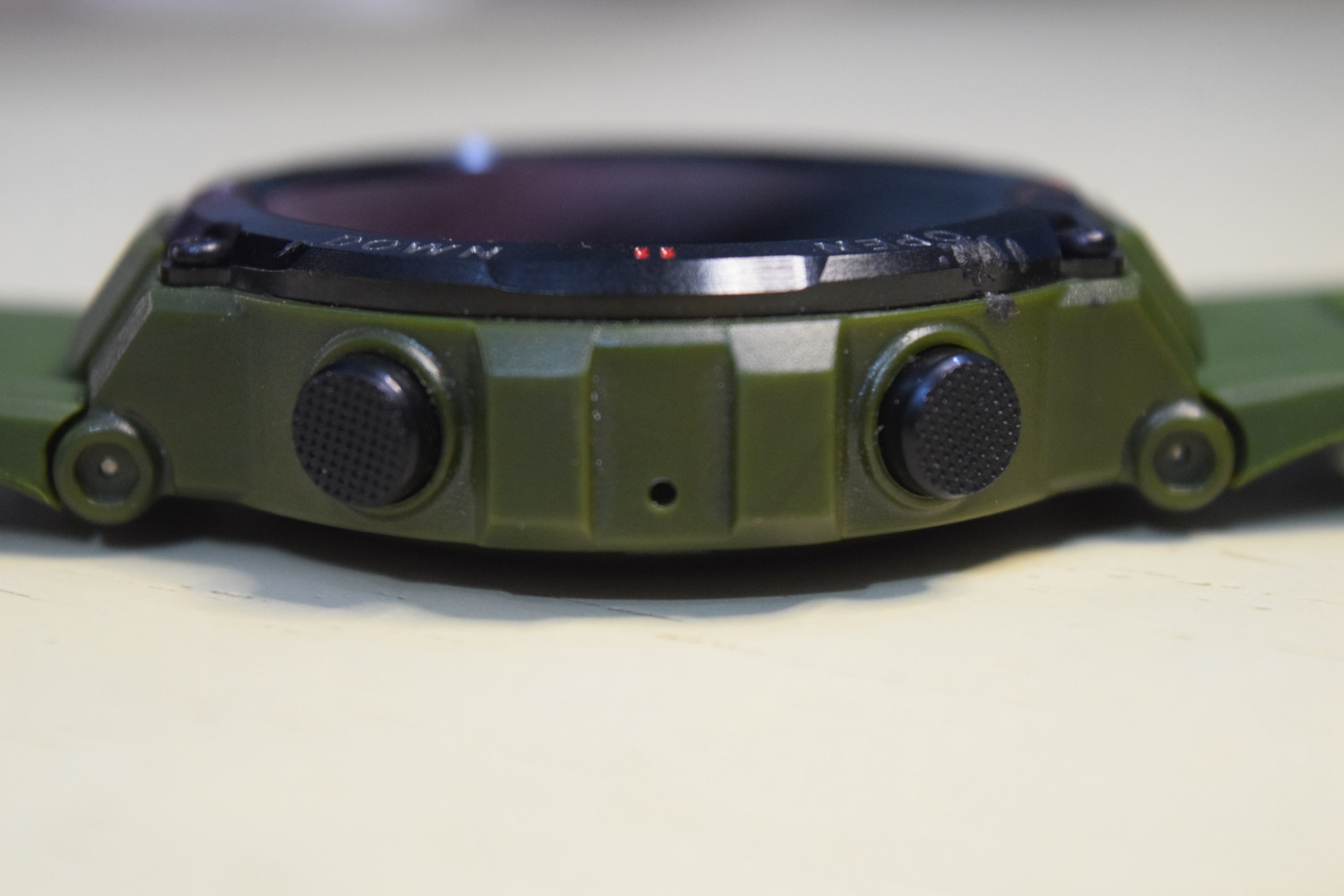 The watch has a 1.3-inch touchscreen display. On the right, it has two side buttons. The top button is to turn the watch display on or off. It can also be used to return to the home screen. The button on the downside lets you scroll through different watch features. At the back, it has a sensor that measures heart rate and blood oxygen monitoring.