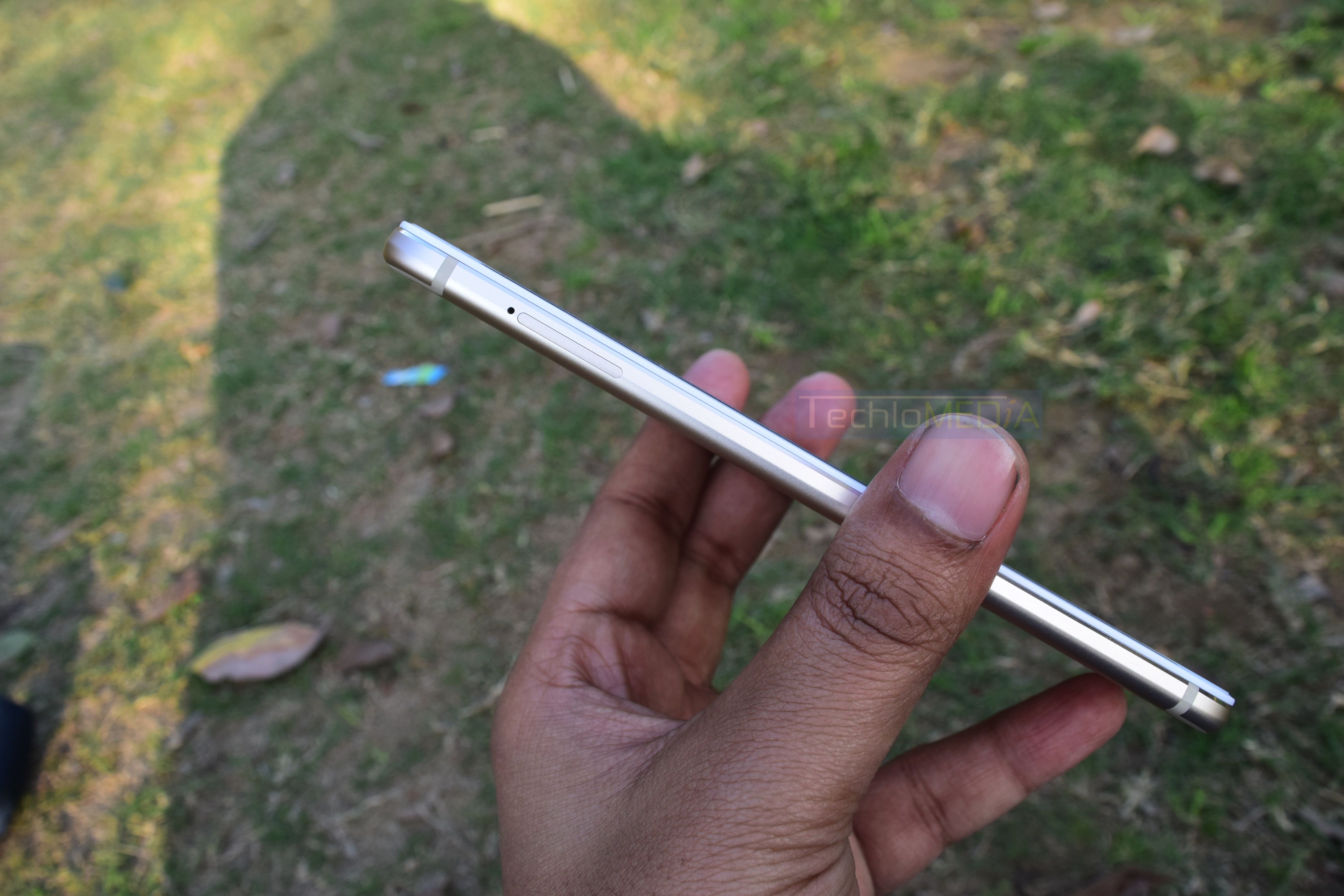 The right side of the phone has the volume rocker and power button. The left edge has SIM tray slot. At the base side, it has audio port, micro USB and a speaker unit. The back panel has iPhone 7 Plus like placing of antenna bands and camera module along with Vivo branding at center.
