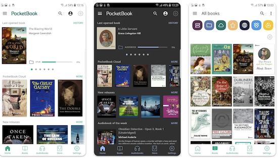 PocketBook is a free app to read ebooks. The app supports 19 book formats including EPUB, FB2, MOBI, PDF, DJVU, DOCX, RTF, TXT, HTML, and more. It also supports CBR and CBZ comic book formats. It also features a built-in TTS (Text-to-speech) engine for listening to any book you want. There is a built-in bookstore with large and regularly updated content. You can also connect the app with Dropbox, Google Drive, or Google Books to create a personal consolidated library of ebooks. It also supports audiobooks. So, you can listen to audiobooks and other audio files.